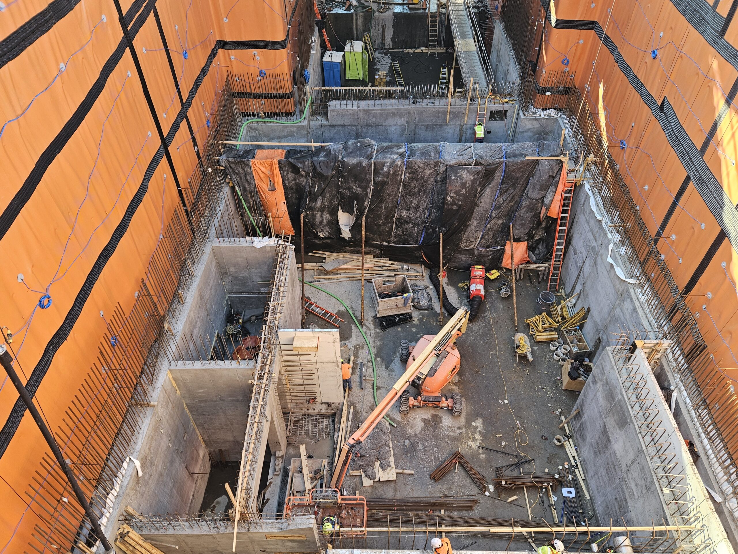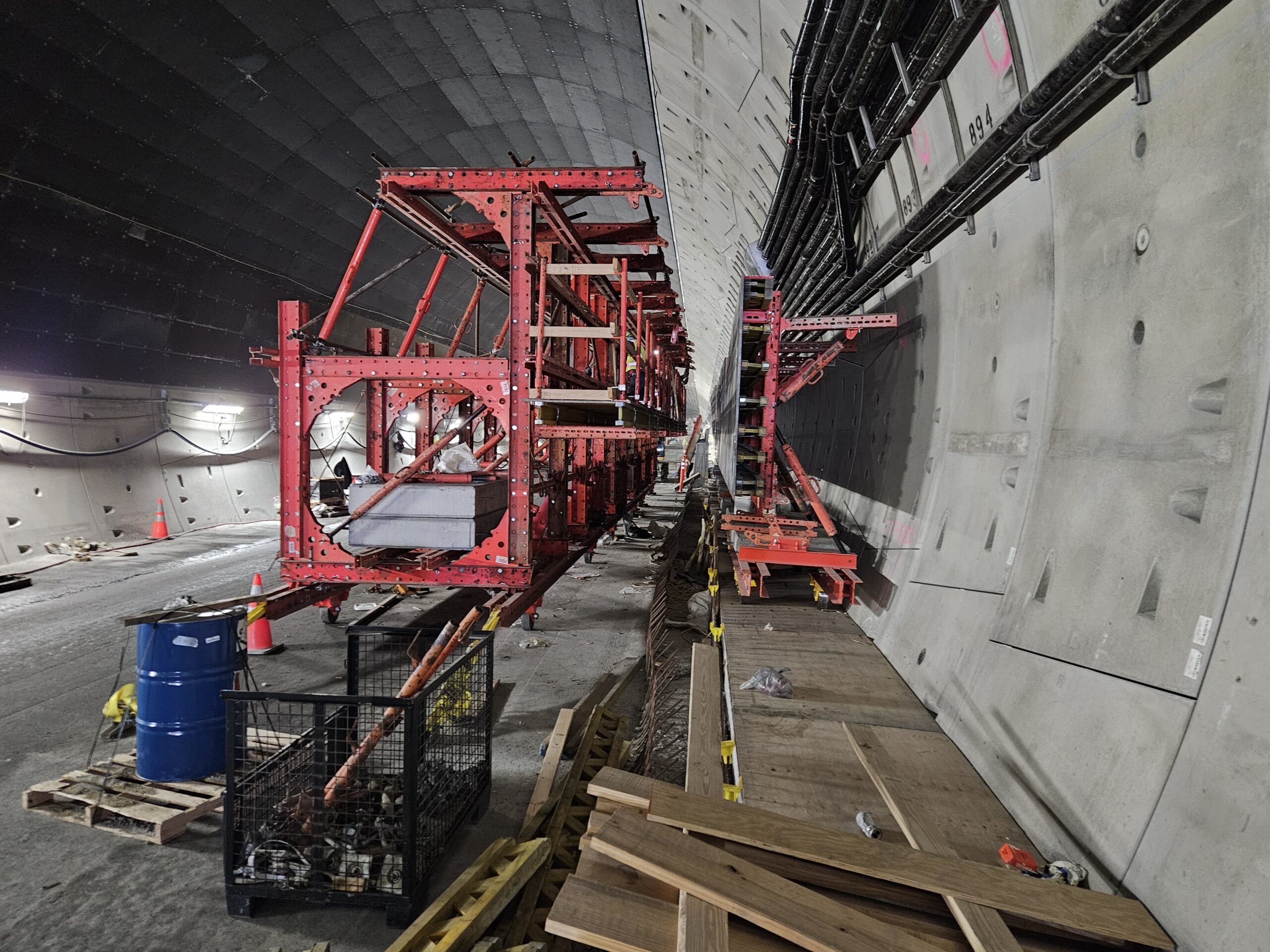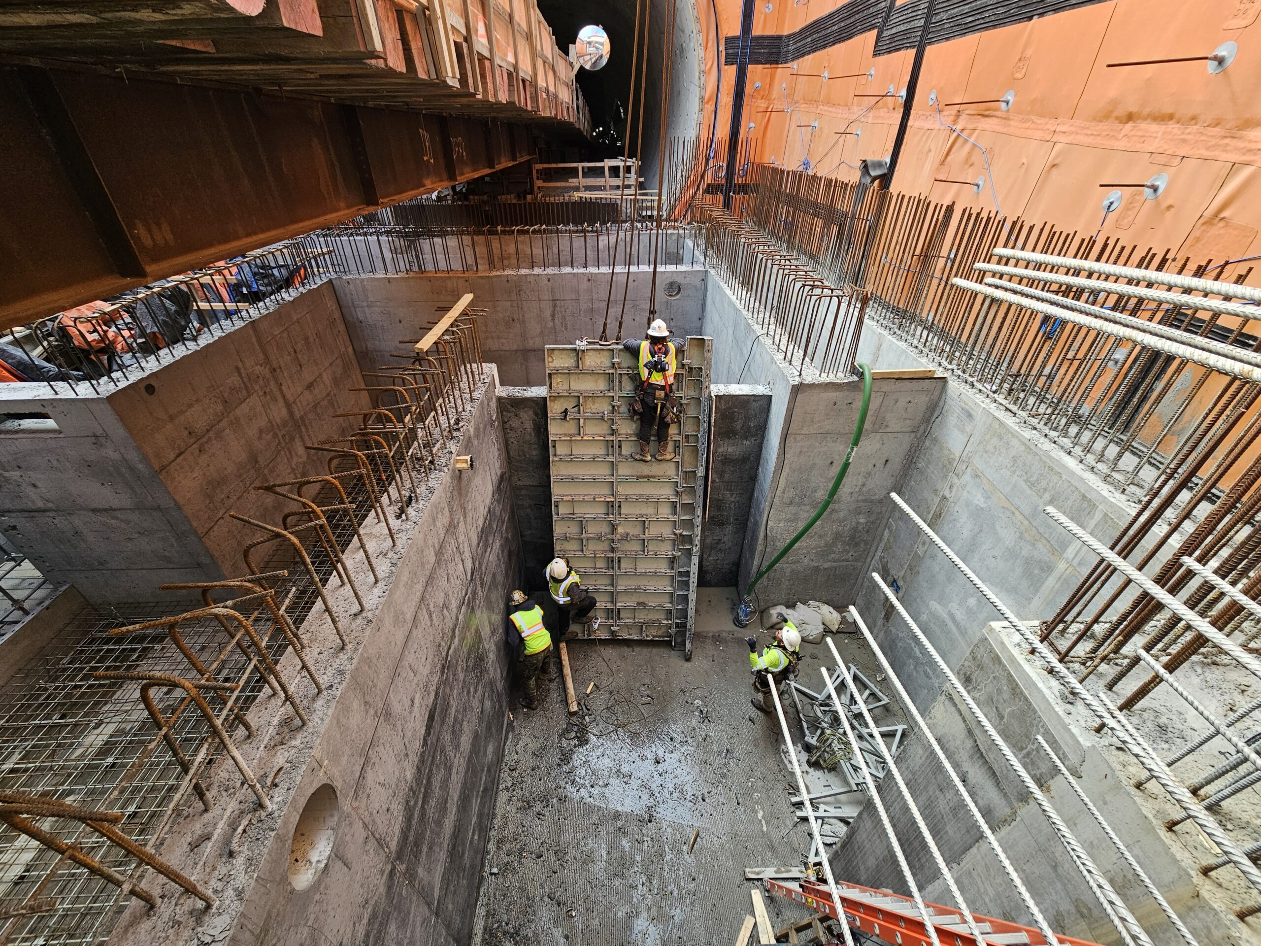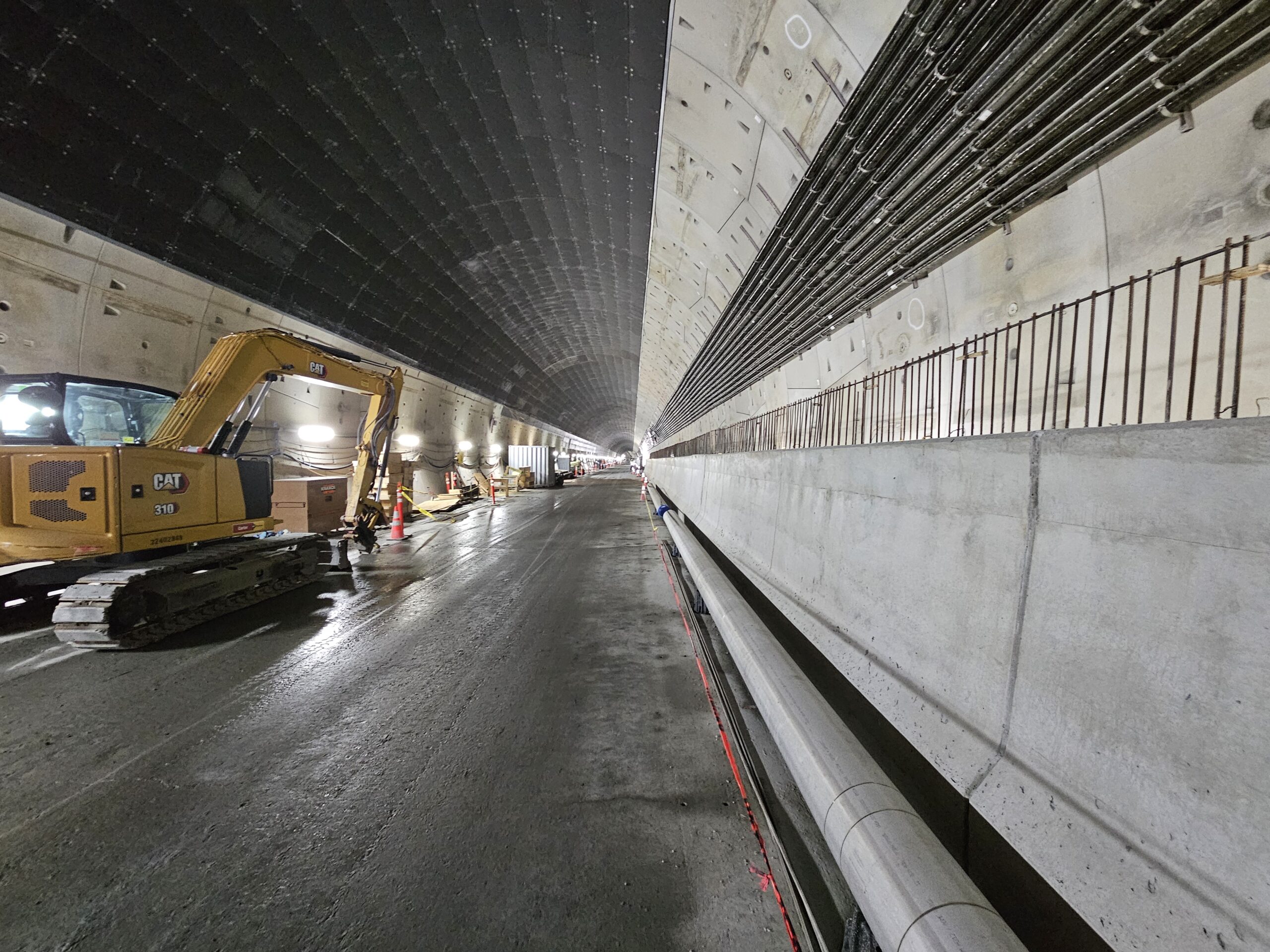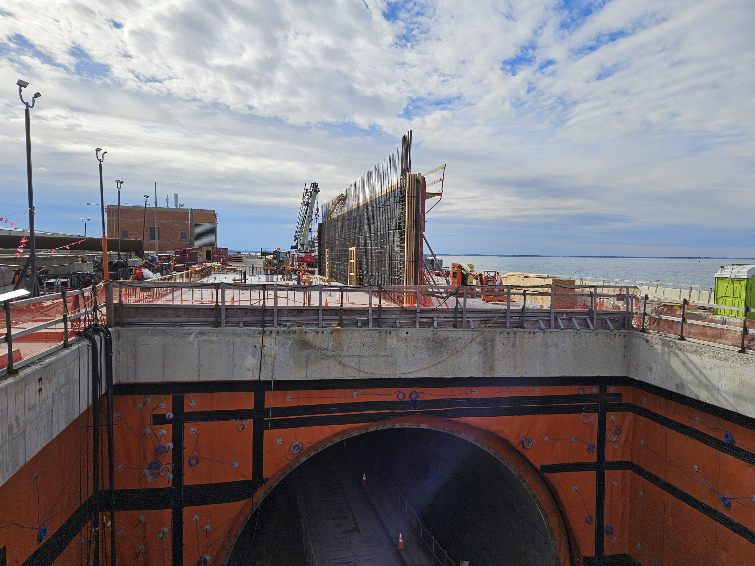 At the tunnel portals, installation of the waterproofing membrane – the bright orange material seen in photos – must be completed before concrete walls can be formed and poured. Concrete walls for the portal pump rooms, located below the roadway on each island, are now complete.