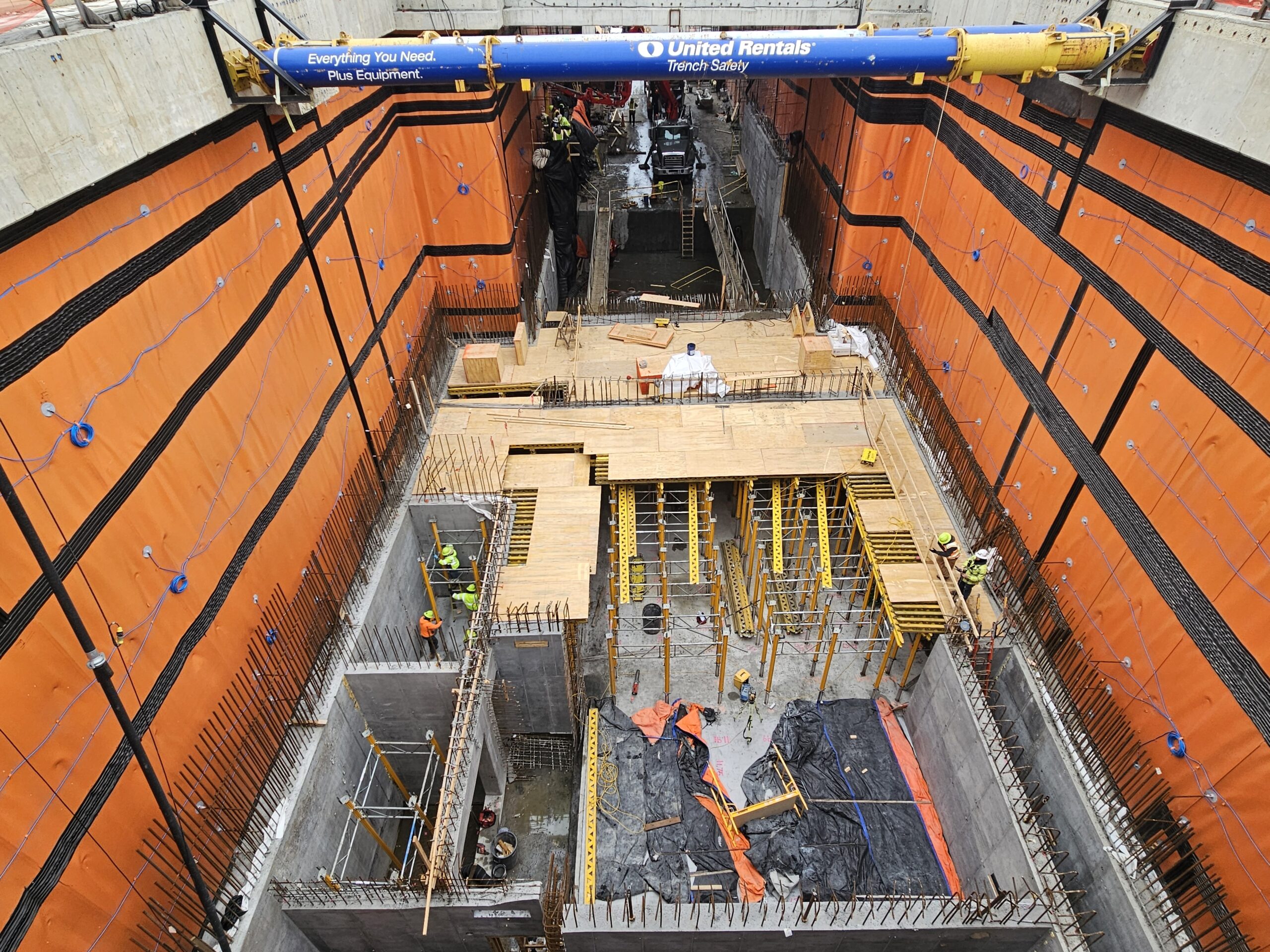 Pictured above is the orange waterproofing for the tunnel’s open approach. Walls of the ventilation building are visible.
